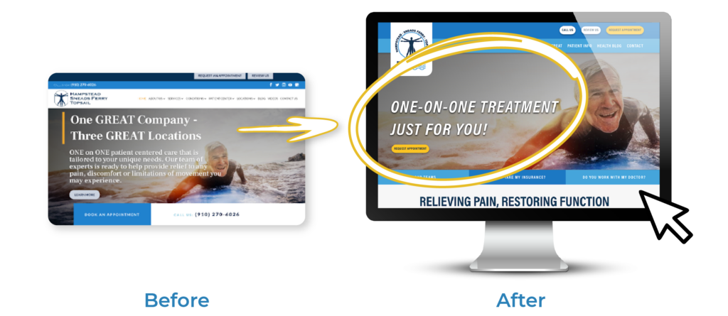 Here’s a great example from Hampstead PT. Before they updated their website, their header focused on themselves: “One GREAT Company.” But after they joined Practice Promotions, their header focused on the patient and their pain, through the words “One-on-One Treatment Just for You” and “Relieving Pain, Restoring Function.”